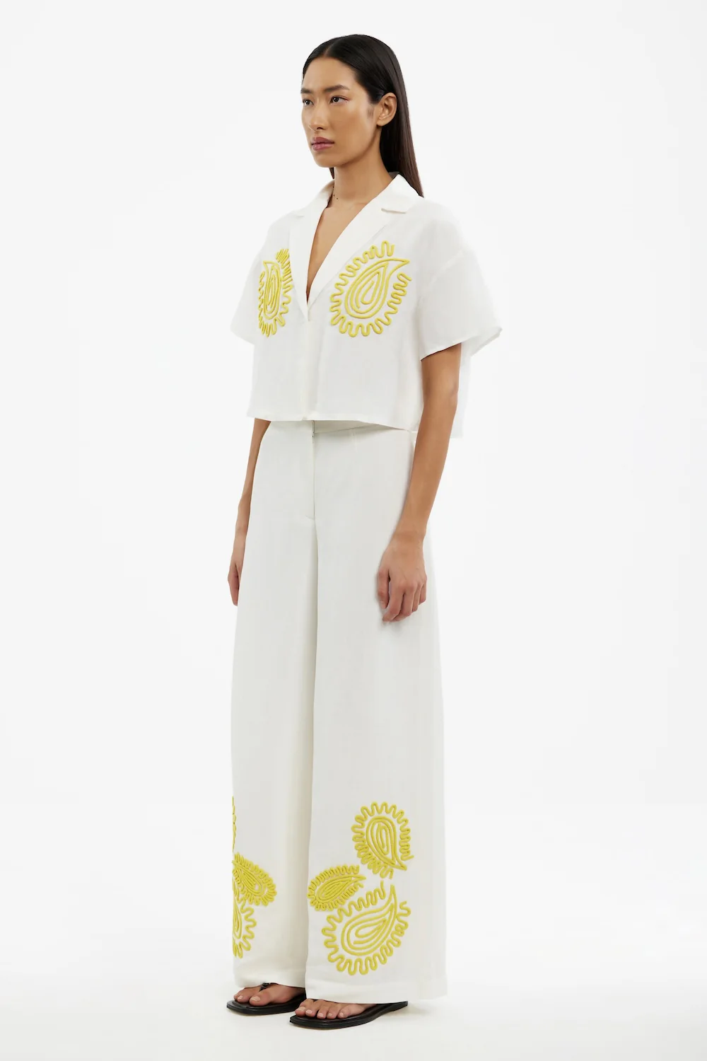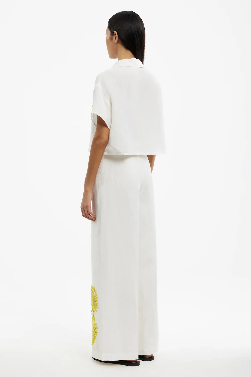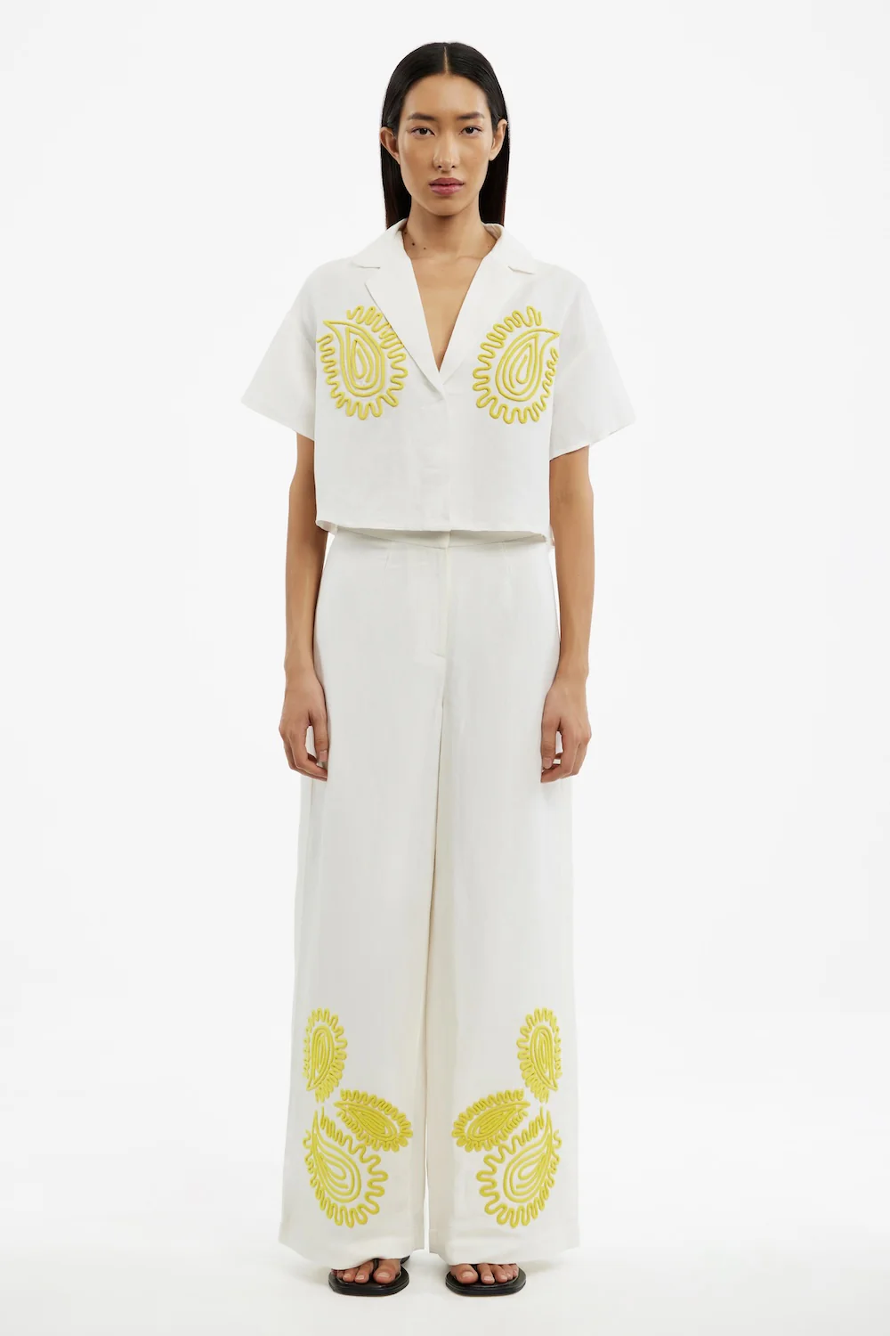 A fresh take on tailoring, the Carly Pant in Lemon combines structure with artistic flair. These high-waisted, wide-leg pants feature striking contrast embroidery at the front hem, adding texture and a unique touch. Fully lined for all-day comfort, they’re finished with a clean front fly closure, making them as functional as they are stylish.